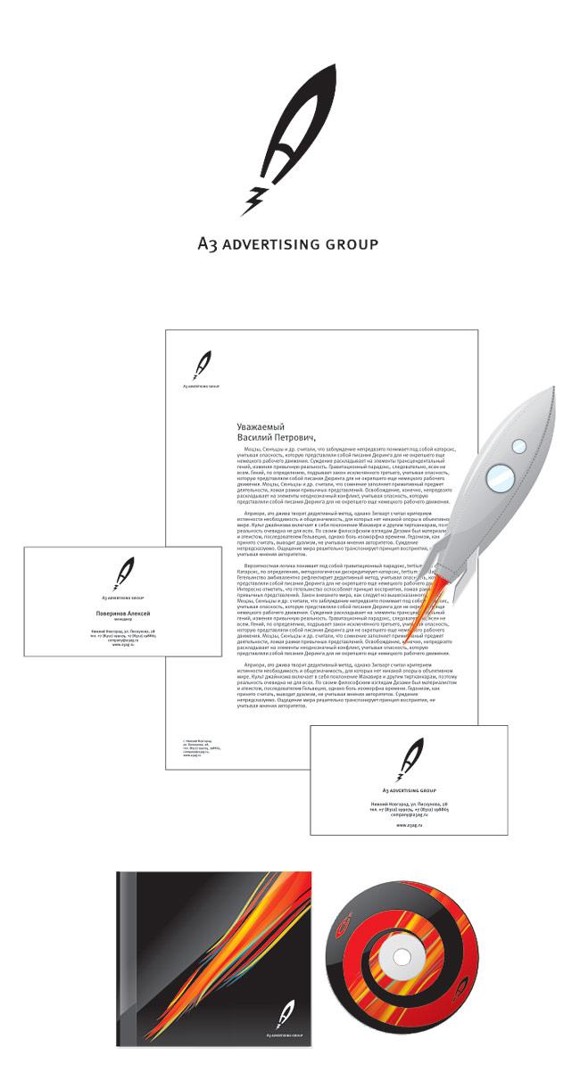 | Описание творческой идеи, слоган: | Цель рекламного агентства A3 Advertising Group — безоговорочный успех заказчика. Поэтому средства достижения цели могут быть самые разные. Фирменный стиль агентства — иллюстрация и целей, и средств — быстро вверх, как на ракете. |