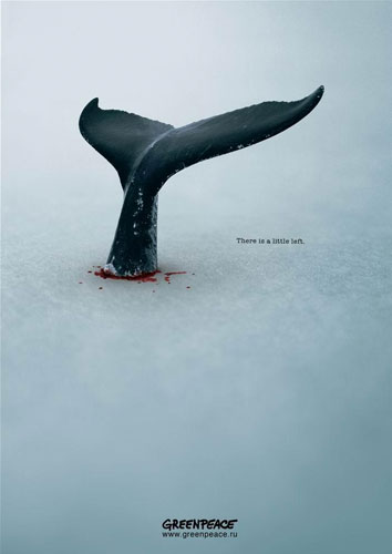 | Описание творческой идеи, слоган: | Изображен хвост кита, который пробивается сквозь лед, на льду капли крови. Идея – показать, что китов остается все меньше. Реклама в поддержку программы защиты животных Greenpeace. |