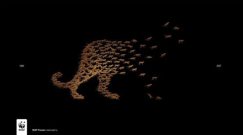 | Описание творческой идеи, слоган: | Леопард, состоящий их маленьких изображений леопардов, которые постепенно рассеиваются. Идея – показать, что леопардов становится с каждым годом все меньше. Реклама в поддержку программы защиты редких животных WWF России |