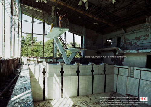 | Описание творческой идеи, слоган: | Прошло 20 лет со дня Чернобыльской катастрофы. Чернобыльский ландшафт напоминает пустырь. Еще больший вред был нанесен местным жителям, их здоровъю и душевному состоянию. Красный Крест предоставляет им медицинскую и психологическую поддержку. Не забывайте о Чернобыле. |