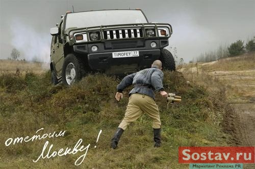 Прочь с дороги! Владимир Цеслер призывает к битве за МосквуTsesler Artstudio решила, что движение против олигархов идет - и оно не может остаться не замеченным публикой. Владимир Цеслер разработал новый плакат "Отстоим Москву", который взывает к ратным подвигам Великой Отечественной войны. "Это просто социальный плакат проблемы, которая сейчас возникает: очень серьезного расслоения общества, - рассказывает Sostav.ru Владимир. - Смыслами наполнять эту картинку будут те кто ее смотрит, а сама по себе - это ситуация сегодняшнего дня глазами автора. Ну разве не об этом мы смотрим и слышим каждый день по телевидению и радио? Да, наверно, клевый плакат для политического движения НАШИ, но в политику мы не лезем". Пока данная наработка не будет использована в рекламных целях, но как подчеркнули в Tsesler Artstudio, возможно, проект станет участником конкурса социальной рекламы. Возникает вопрос, зачем в плакате использована известная марка автомобиля и не будет ли это рекламой HUMMER? Владимир Цеслер так комментирует эту ситуацию: "У нас же это модно, все крутые, стараются подписаться, так и на автомобильном номере присутствует подпись "Timofey". HUMMER - это просто острый момент, характерная черта". Дмитрий Захаркин, Sostav.ru |