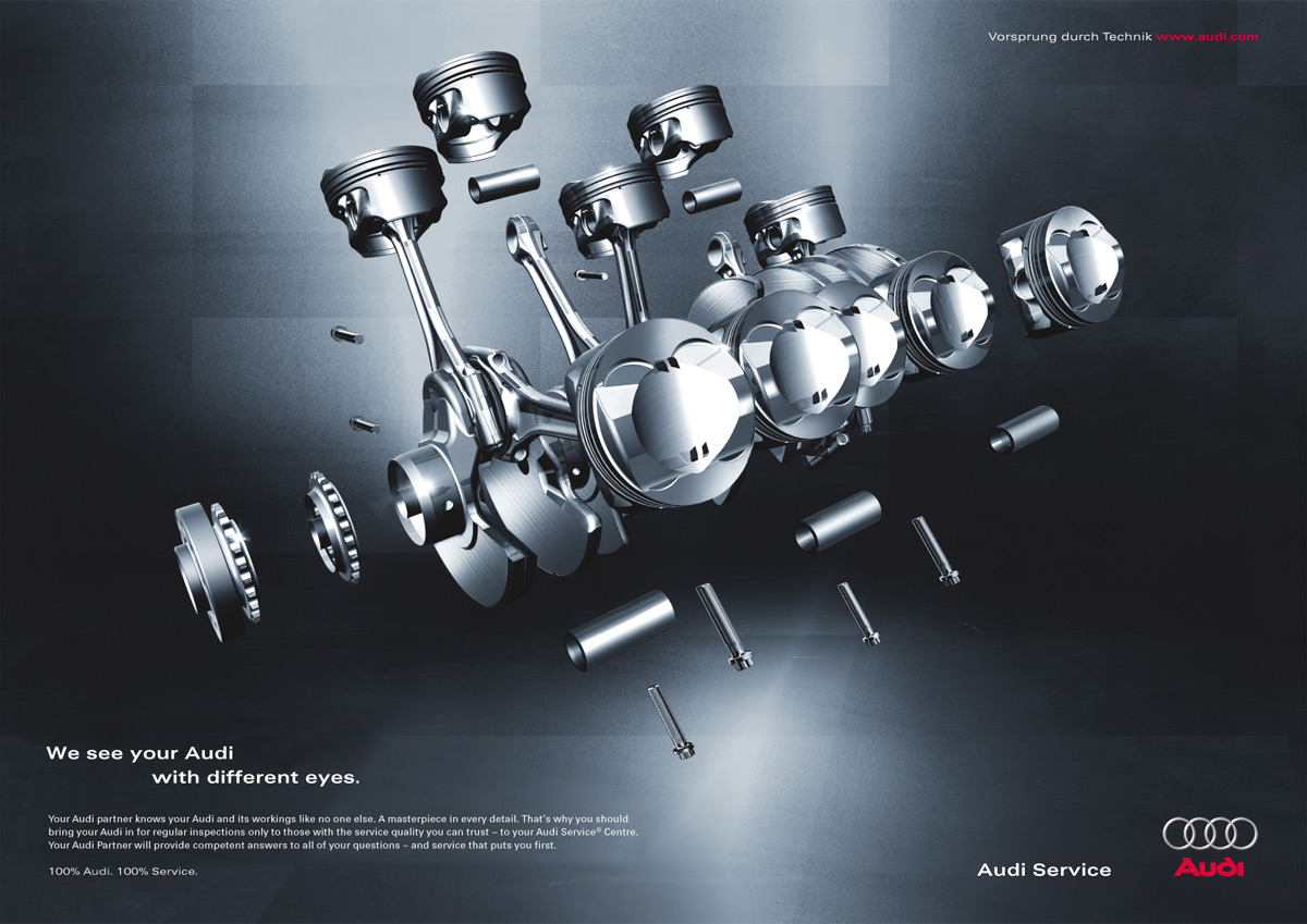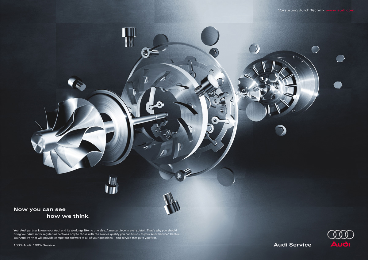 В сервисах Audi смотрят на всё иначеПоказывая крупным планом некоторые детали автомобиля и их устройство, немецкое агентство DraftFCB пытается показать нам, насколько хорошо работники специализированных сервисов Audi знают свою работу: все их мысли только об устройстве автомобиля, он смотрят на него не как на транспортное средство, а как на набор деталей и замечают то, что не видят другие. Надпись: "Теперь вы можете видеть, как мы думаем. Мы смотрим на вашу Audi другими глазами. Некоторые не видят этого. Другие должны знать. Ваш дилер Audi знает вашу Audi и ее работу как никто другой. Шедевр в каждой детали. Именно поэтому вы должны проходить регулярный технический осмотр Audi в тех сервисах, качеству которых вы доверяете - в ваших сервисных центрах Audi. Ваш дилер Audi предоставит компетентные ответы на любые ваши вопросы и обслуживание, для которого вы на первом месте. 100% Audi. 100% Сервис." Агентство: DraftFCB, Гамбург, Германия Творческий директор: Alexander Gutt, Bill Marbach Арт директор: Andreas Miller Копирайтер: Michael Zimmermann Фотограф: Iver Hansen |