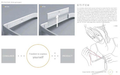 Очки с вышивкойПромышленный дизайнер Сёюнгуб О (Seungyoub Oh) выигрывал японский Opus Design Award на протяжении двух лет, в 2005 и 2006. Последний победивший объект — очки с вышивкой.