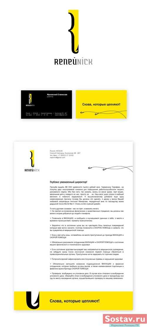 Нейминговое агентство "ReпейNick" ловит клиентов на рыболовный крючокКреативное бюро "Piranhadesign.ru" разработало фирменный стиль для неймингового агентства "ReпейNick". - "Перед нашей командой была поставлена задача сделать незаурядный, но в то же время деловой и изящный имидж агентства. Идея фирменного стиля родилась благодаря удачному неймингу компании-заказчика. Основой концепции стала визуализация "слов-цеплялок", а другими словами слоганов и имен торговых марок, которые и являются продукцией агентства. Это и стало главной графической идеей логотипа и всего фирменного стиля. Теперь клиенты "Репейника" смогут рассчитывать на поимку "крупной рыбы" - рассказывает арт-директор "Piranhadesign.ru" Антон Шинелин. ![]() |