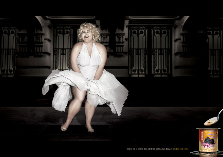 Fit Light: если красавица разжирелаБразильское агентство Salles Chemistri считает, что такие секс-символы как Мина Сувари ("Красота по-американски"), Мэрилин Монро, Шэрон Стоун никогда не перестанут нравиться мужчинам. С помощью этих принтов нам дают понять, что нужно стремиться к идеальной фигуре, а в этом вам может помочь йогурт Fit Light. Надпись: "Забудьте об этом. Мужские предпочтения никогда не будет изменяться. Йогурт Fit Light." Агентство: Salles Chemistri, Сан-Паулу, Бразилия |