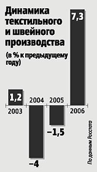 Вчера в Минпромэнерго сообщили, что рост текстильной и швейной промышленности в России в январе – апреле 2007года составил 10,2% по сравнению с аналогичным периодом 2006 года. Но радоваться пока нечему. По данным таможенников, объемы зарубежных поставок текстильных изделий и обуви увеличились за этот же период в стоимостном выражении на 73,5%. Это значит, что рынок насыщается импортом – пусть не очень качественным, зато дешевым.