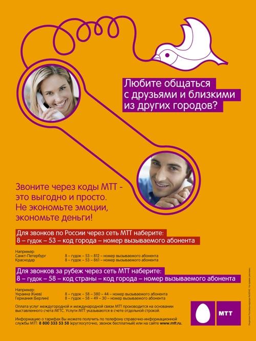 Все зоны доступа: РА MOVIE запустило рекламную кампанию МТТМультимедийная кампания национального оператора междугородной и международной связи "Межрегиональный ТранзитТелеком" (МТТ) "Коды доступа" стартовала в июне. Согласно условиям подписанных контрактов на стратегическое, креативное и медиа обслуживание, РА MOVIE выполнило для МТТ ряд работ. В рамках рекламной кампании по продвижению услуги "Международные и Междугородние Коды доступа МТТ", агентство создало рекламный ролик и предложило креативные решения для рекламных материалов, размещаемых в метро, на транспорте, в печатных СМИ и информационные материалы для распространения на узлах связи. Рекламный ролик МТТ "МТТ - ключ к бесконечному общению" можно увидеть на телеканалах Первый, Россия, СТС. Состав творческой группы Клиент: ОАО "Межрегиональный ТранзитТелеком" (МТТ) Креатив: РА MOVIE Креативный директор: Наталья Мусина Арт-директор: Ирина Теплицкая Копирайтер:Евгения Некрасова Дизайнеры: - Родион Фуриков, Руслан Пронин Продакшен "Трёхмер" Директор группы по работе с клиентами - Шушлебин Алексей Менеджер по работе с клиентами - Выгон Анастасия