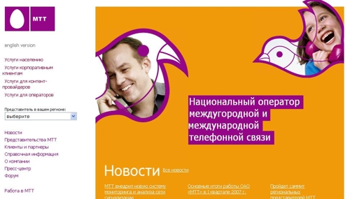 Новый сайт компании МТТ передает новый принцип бренда и ориентирован на идею дружелюбности и открытости. Посетители ресурса смогут узнать о последних новостях компании, получить справочную информацию и попасть на форум по обсуждению сети. Новый сайт был разработан в сотрудничестве с компанией Actis Systems. Дизайн-студия является одним из ведущих российских разработчиков и поставщиков интернет-решений для бизнеса. Сэкономить время посетителям удалось благодаря удобной навигации и простой структуре сайта. Например, информация об услугах МТТ разбита на несколько разделов для физических и юридических лиц, контент-провайдеров и операторов связи.