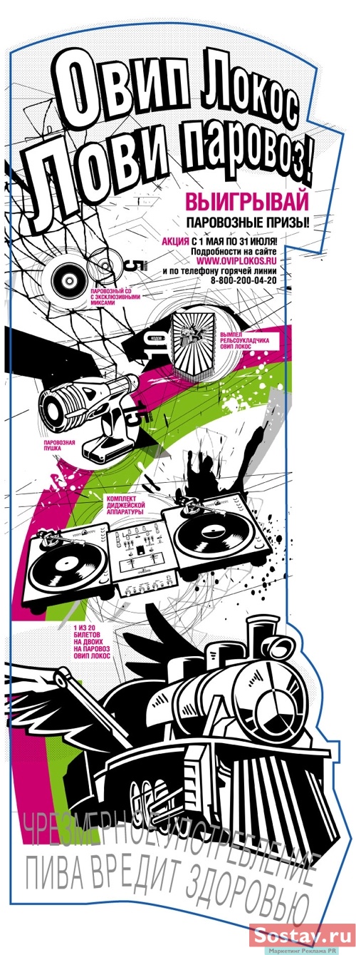 Призы, среди которых CD с миксами, вымпелы и даже загадочные паровозные пушки, разыгрываются каждые 10 минут. Самые активные участники получат в подарок комплект ди-джейской аппаратуры, а также шанс выиграть главный приз - 2 билета на паровоз, который проследует через всю Россию на закрытую вечеринку "Овип Локос" в один из клубов Москвы. Всю дорогу в распоряжении счастливчиков будет работать уникальный мобильный клуб с известным ди-джеем и стратегическим запасом пива "Сокол".