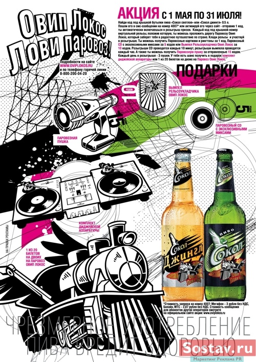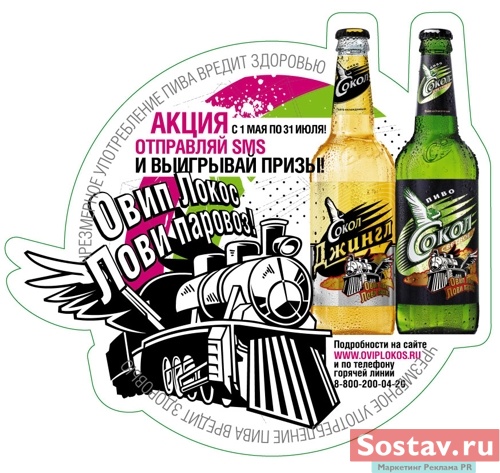 ЗАО Пивоварня "Москва-Эфес" совместно с агентством маркетинговых коммуникаций R&I Group поставило национальную рекламную акцию пива "Сокол" на рельсы. Лозунг кампании - "Овип Локос - Лови Паровоз". Суть акции заключается в том, что с 1 мая по 31 июля всем желающим предлагается найти код под крышкой пива "Сокол", отправить его по смс на номер 4007 и включиться в игру "Лови Паровоз".