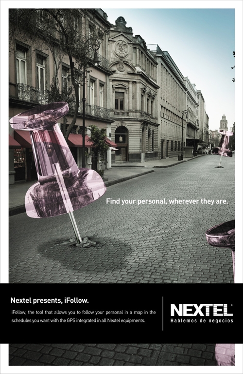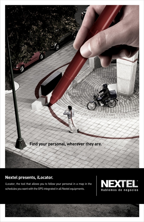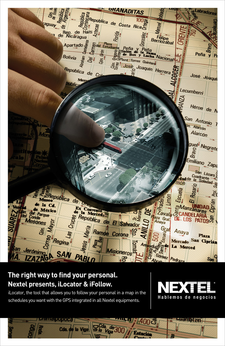 Nextel и агентство Teran/TBWA Мехико: подозреваете жену в измене? Слежка вам поможетВы хотите знать, где сейчас ваша жена, или вы волнуетесь за ребенка. С новыми устройствами Nextel вам больше не придется волноваться, ведь с их помощью можно найти и проследить весь маршрут близкого вам человека. Причем Nextel предоставляет точную информацию, что и пыталось показать агентство Teran/TBWA на этих принтах. Надпись: "Найдите ваших близких, где бы они ни были. Правильный путь для поиска ваших близких. Nextel представляет iFollow и iLocator. Инструменты, позволяющие вам следовать за вашими близкими по карте в том режиме. В котором вы хотите с интегрированным во все устройства Nextel GPS." Агентство: Teran/TBWA, Мехико, Мексика Творческий директор: Gonzalo Munoz Арт директор: Pedro Sugranes Копирайтер: Armando Plascencia Иллюстратор: Render Zero Фотограф: Flavio Bizarri |