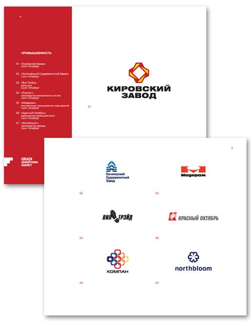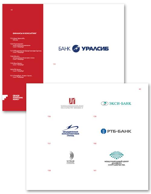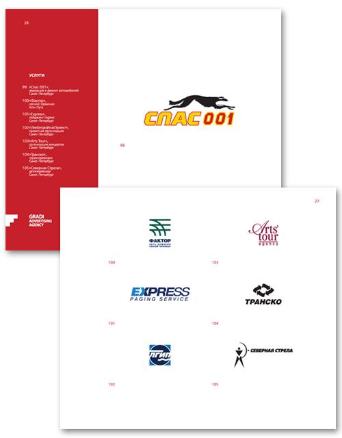 Сборник включает около двухсот логотипов, созданных в различные годы деятельности GRADI и отражает ряд бизнес-направлений - финансы, строительство, торговля, легкая, тяжелая, пищевая промышленности, коммуникационные услуги и др.