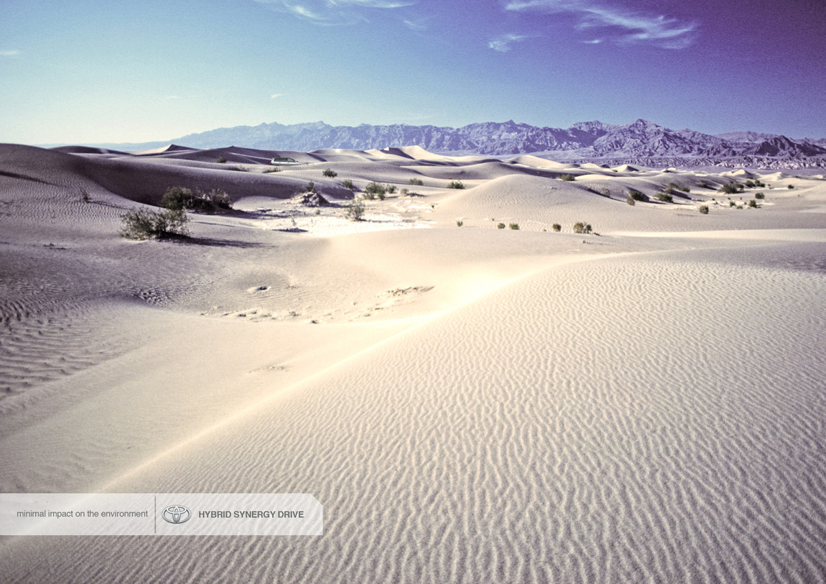 Найдите машину в рекламе Toyota от агентства Miami Ad SchoolОказывается, воздействие автомобиля на окружающую среду проявляется в том, насколько сильно его заметно. Во всяком случае, именно к такому выводу можно придти, увидев эту рекламную кампанию, созданную школой рекламы Miami Ad School. Вам придется напрячься, чтобы заметить на этом пейзаже автомобиль Toyota. Надпись: "Минимальное воздействие на окружающую среду. Гибридный двигатель Hybrid synergy drive" Школа рекламы: Miami Ad School, Майами-Бич Творческий директор: Paul Ewen Арт директор: Guenduez Erdil Копирайтер: Lauren Oliver |