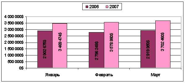 Диаграмма 1 - Сравнительная динамика изменений рекламных бюджетов по месяцам, I квартал 2006, 2007 гг.