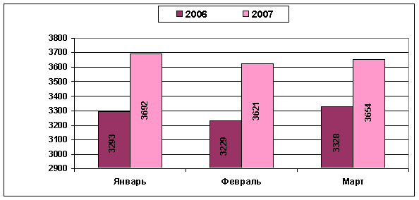 Диаграмма 2 - Сравнительная динамика изменений количества выходов рекламы по месяцам, I квартал 2006, 2007 гг.