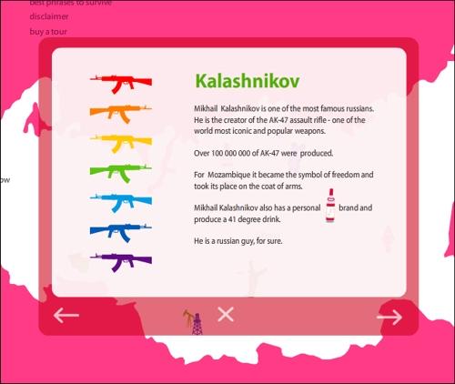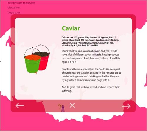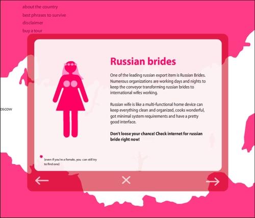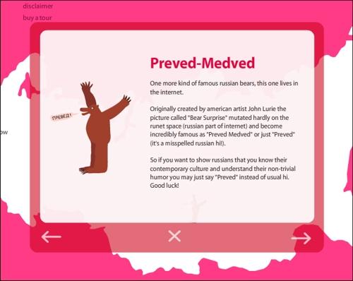 Сайт очень позитивен (ибо на оси зла Елене жить категорически надоело), и представляет собой собрание расхожих (и не только) мифов о России. Помимо традиционных балалаек, медведей, водки, чёрной и красной икры, здесь, например, есть «русские невесты», футбольная команда Челси, а также Медвед, от которого в последнее время, решительно никуда не деться.