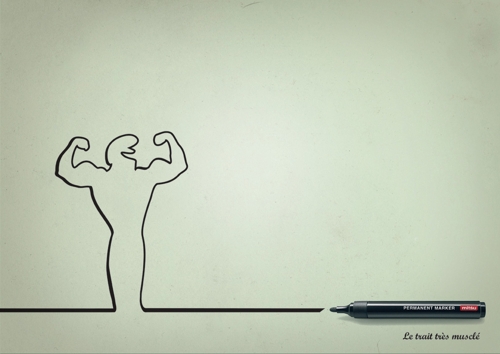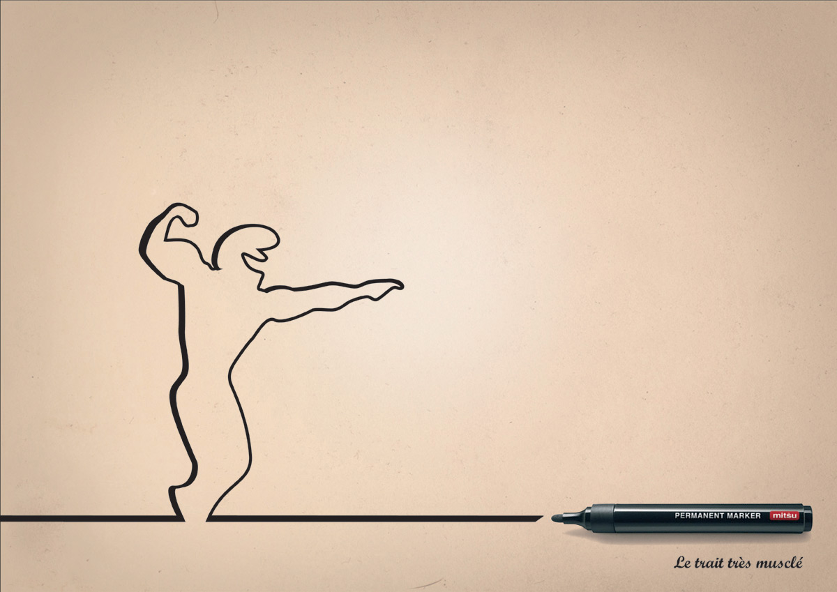 Сильные линии маркеров MitsuЧтобы показать насыщенность, толщину и четкость линий, остающихся после маркеров от компании Mitsu, было решено использовать в рекламе образ культуриста. Причем этот культурист и был нарисован рекламируемым маркером. Надпись: "Очень сильная линия." Творческий директор: Nicolas Stigset Копирайтер: Maxime Dusart |