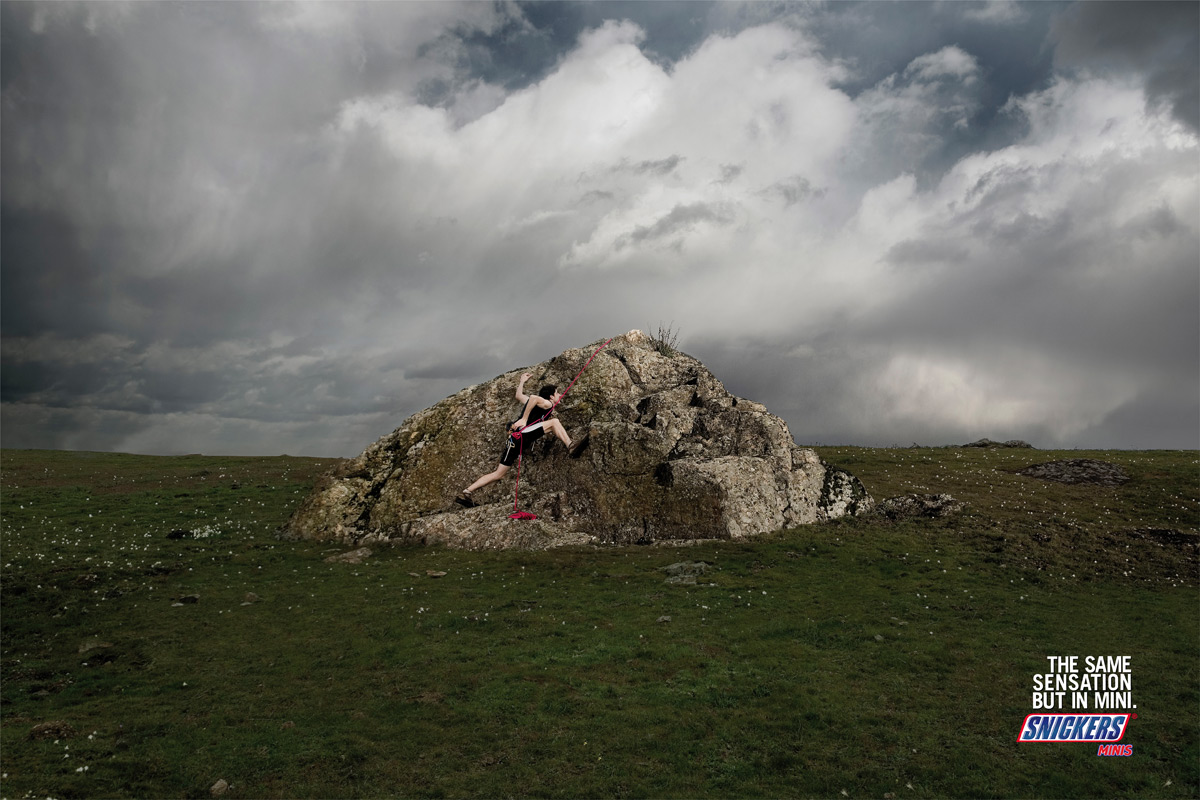 Snickers mini похож на восхождение на маленькую скалуИспанское рекламное агентство Tiempo BBDO считает, что Snickers mini ничем не отличается от обычного батончика за исключением его размера. А этот плакат призван донести эту мысль до нас, хотя ощущения от скалолазания на большой и маленькой скалах все-таки отличаются. Надпись: "Те же ощущения, только в маленькой упаковке. Snickers mini" Агентство: Tiempo BBDO, Мадрид, Испания Творческий директор: Andres Martinez Echeverria Копирайтер: Martin Subercaseux Арт директор: Artemio Buneta Фотограф: Michael Selley Продюсер: Mayte Carabias Аккаунт: Maria Lopez Chicheri, Rocio Abarca |