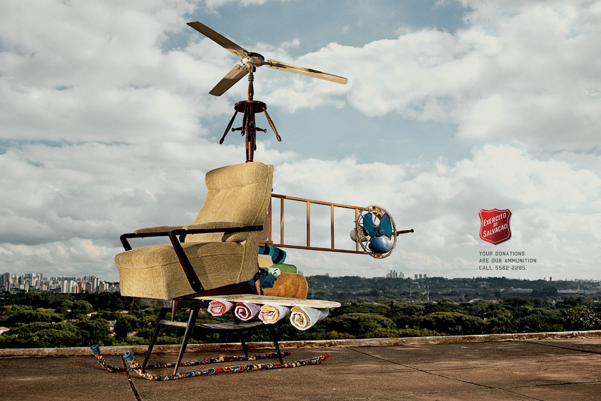 Агентство McCann Erickson показывает, на чем летает Армия спасенияВот так, по мнению бразильского рекламного агентства McCann Erickson, выглядел бы вертолет Армии спасения (Salvation Army), если бы она создавала свою экипировку только из пожертвований граждан. Такой вертолет не только не взлетел бы, но и развалился бы на части при малейшем сотрясении. Надпись: "Ваши пожертвования - это наша амуниция" Агентство: McCann Erickson, Сан-Паулу, Бразилия Главный творческий директор: Adriana Cury Творческий директор: Adriana Cury, Milton Mastrocessario, Ana Clelia Quarto, Danilo Janjacomo Копирайтер: Marcelo Padoca Арт директор: Fernando Reis Фотограф: Zarella Neto Продюсер: Jorge Gaglioni, Marcelo Pinto Аккаунт: Fernanda Costa |