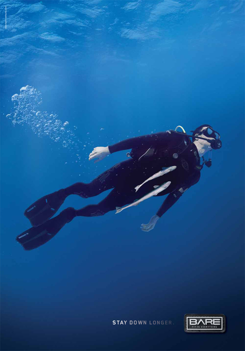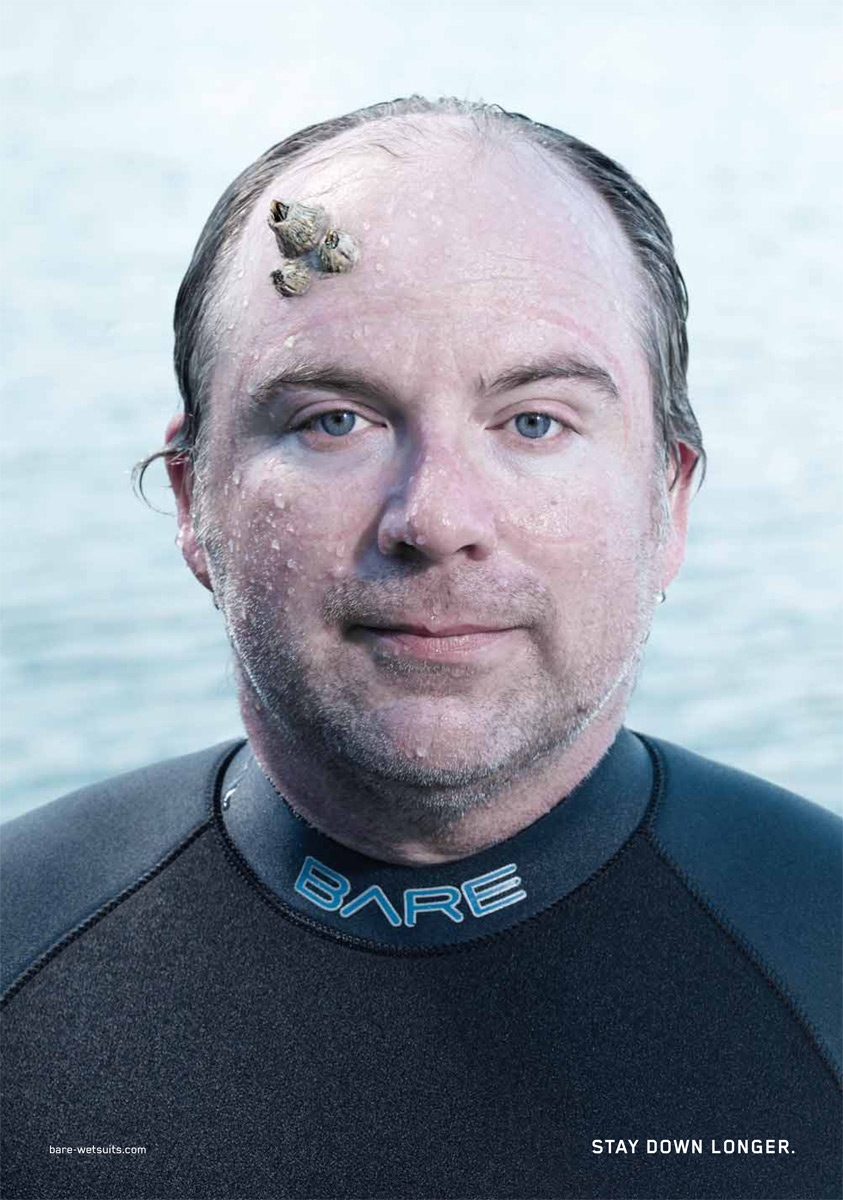 Команда "Летучего голландца" позавидует вашему внешнему виду после костюмов для подводного плавания BareКанадское агентство Rethink призывает вас оставаться под водой дольше, так долго, что ваша кожа станет похожа на сморщенную сливу, на ней нарастут ракообразные, а рыбы-прилипалы будут сопровождать вас, словно кита. Все это станет возможным благодаря костюмам Bare. Надпись: "Оставайся внизу дольше. Bare. Быть в пору - это все" Агентство: Rethink, Канада |