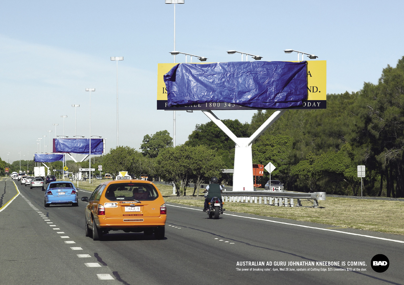 Brisbane Advertising & Design и агентство George Patterson Y&R прячут плохую рекламуВ клуб Brisbane Advertising & Design, устраивающий лекции о рекламе, приезжает австралийский гуру в области рекламы Jonathan Kneebone. По этому поводу агентство George Patterson Y&R прячет и убирает с улиц Брисбена всю второсортную, по их мнению, рекламу. Надпись: "Гуру австралийской рекламы Jonathan Kneebone приезжает. "Сила сломанных правил". 6 часов вечера, среда 28 Июня, второй этаж Cutting Edge. $25 (членам $20) при входе. BAD" Агентство: George Patterson Y&R, Брисбен, Австралия Арт директор: Lars Vester Копирайтер: Shane Murray Фотограф: Erik Williamson Ретушер: John Shard |