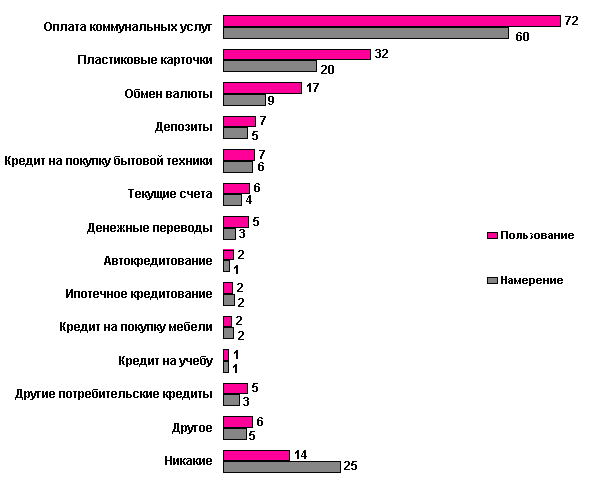 Диаграмма 1: Использование и намерение воспользоваться банковскими услугами. 1 По данным MMI 2006 - опрос проводился в 11 городах Казахстана с населением 200 тыс. и более, среди людей в возрасте от 15 лет и старше. Объем выборки составил 2500 респондентов. На втором месте - использование пластиковых карточек. Причем основной целью использования пластиковых карточек является обналичивание денег через банкомат. Этой услугой пользуются 29% населения Казахстана (см. Диаграмма 1). Большинство обладателей пластиковых карточек (25%) приобрели их через организацию для получения заработной платы или стипендии, тогда как по собственной инициативе пластиковые карточки оформили только 6% казахстанцев. Диаграмма 2: Цели использования пластиковых карточек. Пятерку самых популярных банков Казахстана возглавляет Народный банк Казахстана. Его знают 81,8 % населения, а его услугами пользуются 61,3%. Замыкает пятерку лидеров Банк Каспийский. Услугами этого банка пользуются 7,7% населения Казахстана, а знают его 55%. Таблица 1: Знание и пользование услугами банков. ТОР - 5