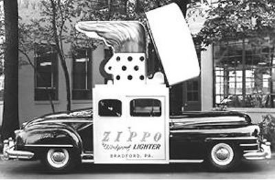 Этот рекламный автомобиль был сделан из седана образца 1940 года, пассажирские кресла сняли и заменили на две гигантские зажигалки ZIPPO, которые открывались и демонстрировали прохожим неоновое пламя.