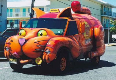 Этот автомобиль был выполнен в виде облизывающегося кота (язык был расположен на передней панели авто и снабжен специальный мотором). Многочисленные «мяу-мобили», разъезжавшие по стране, доставляли кошачью еду торговой марки Meow Mix тем людям, которые по каким-то причинам не могли ее купить самостоятельно.
