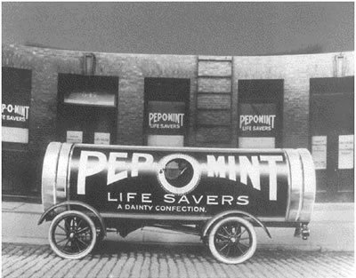 Один из старейших рекламных автомобилей был создан в 1918 году для рекламы освежающих леденцов компании Pep-O-Mint и выглядел как жестяная банка на колесах.