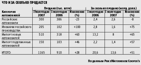 По информации комитета автопроизводителей Ассоциации европейского бизнеса (АЕБ) в России, продажи иномарок в январе – июне 2007 года составили 720 тыс. 143 единицы против 423 тыс. 229 автомобилей за первое полугодие 2006 года. Лидером остается Chevrolet с показателем 84 тыс. 467 проданных автомашин. На втором месте – флагман продаж 2006 года Ford (81 тыс. 782), на третьем – Toyota (72 тыс. 33). Среди наиболее продаваемых иностранных моделей по-прежнему лидирует Ford Focus (46,1 тыс. автомобилей). На втором месте – Renault Logan (31,03 тыс.), на третьем – Chevrolet Lanos (26,439 тыс.). По итогам 2006 года, реализация иностранных легковых машин в России увеличилась на 65% по сравнению с 2005 годом, до более чем 1 млн. автомобилей. Первая половина этого года показывает еще более интенсивный рост продаж.