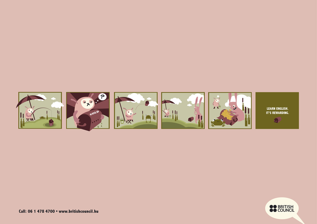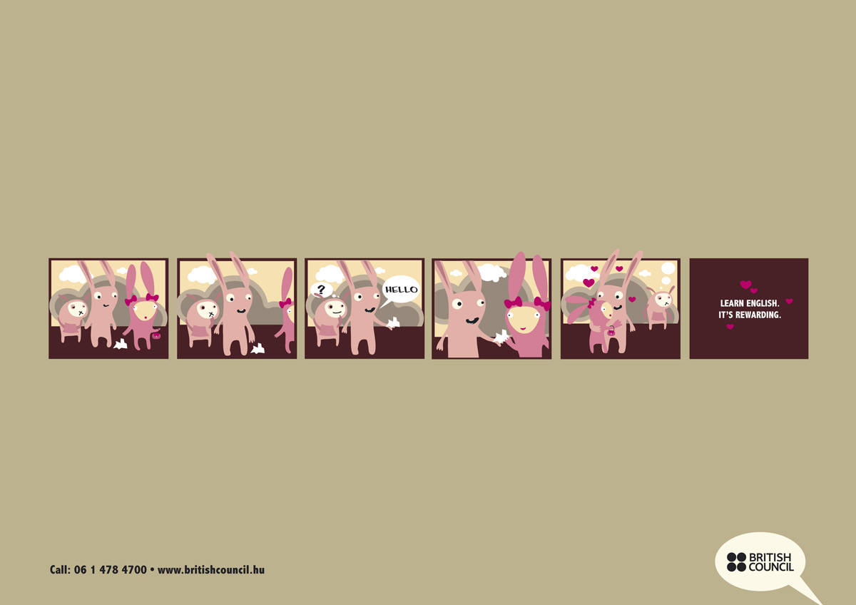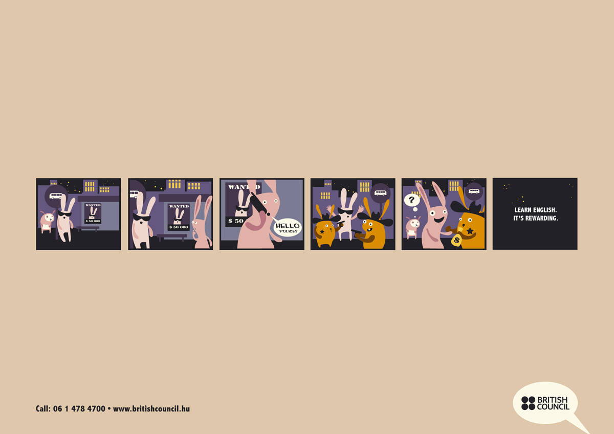 Преуспевающие англоговорящие зайцы в рекламе British CouncilПреимущества англоговорящих людей очевидны, что и пытается показать венгерское агентство Ogilvy & Mather в этой рекламной кампании, созданной для культурного центра Великобритании British Council. На принтах представлено несколько ситуаций, в которых заяц, владеющий английским, неизменно остается в выигрыше. Надпись: "Учите английский. Это вознаграждается. Звоните 06 1 478 4700 www.britishcouncil.hu British Council." Агентство: Ogilvy & Mather, Будапешт, Венгрия Главный творческий директор: Dalbir Singh Творческий директор: Gabor Spielmann Арт директор: Eric Napier, Dalbir Singh Копирайтер: Dalbir Singh Иллюстратор: Melinda Szentpetry, Amsterdam |