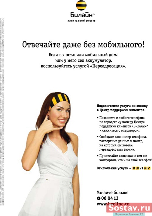 Beeline советует отвечать на звонки без мобильных телефоновТеперь абоненты, забывшие телефон дома, и те, у кого аппарат неожиданно разрядился, могут воспользоваться переадресацией. Для этого нужно связаться с оператором и попросить перенаправлять все входящие звонки с мобильного на городской, междугородный или международный телефонный номер. Рекламная кампания в поддержку услуги "Переадресация" стартовала 9 июля 2007. В качестве каналов коммуникации были использованы телевидение, радио, пресса, а также стикеры в метро. Для того чтобы активировать услугу необходимо позвонить в Центр поддержки клиентов, сообщите свой номер, паспортные данные, а также номер, на который будут переключатся звонки. Стоимость установки переадресации по звонку в Центр поддержки клиентов составляет 45 рублей с учетом НДС. Состав творческой группы BBDO Moscow: Эккаунт-менеджер: Кирилл Солод Эккаунт-директор: Лиз Адомако Арт Директор: Артем Альтман Копирайтер: Екатерина Суворова Руководитель креативной группы: Юлия Довлатова Продюсер агентства: Яна Кузмичева Продакшн хаус: Амбер Режиссер: Антон Ненашев Оператор: Павел Капинос Производство компьютерной графики: Perfect pixels Продюсер: Ирина Силина