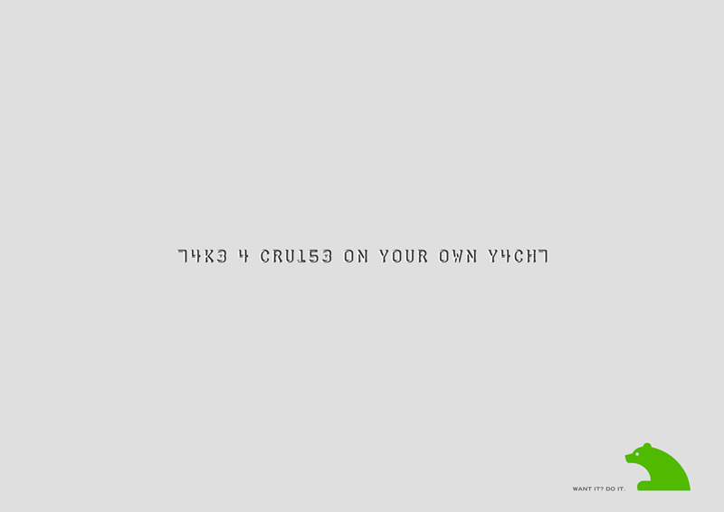 Caja Madrid предлагает свои кредиткиВ наше время все банки предлагают нам кредитные карточки. Исключением не стал и испанский банк Caja Madrid, для которого мадридское агентство Tapsa разработало эту кампанию. Особенностью этих принтов является то, что надписи сделаны стандартным шрифтом пластиковых карт с добавлением цифр. Надпись: "Не ждите скидок. Переезжайте в дом с садом. Отправьтесь в круиз на своей собственной яхте. Хочешь этого? Делай." Агентство: Tapsa, Мадрид, Испания Творческий директор: Edu Martinez-Gil, Seba Blezowski Арт директор/Копирайтер: Gabriel Mahler, Ernesto Soto |