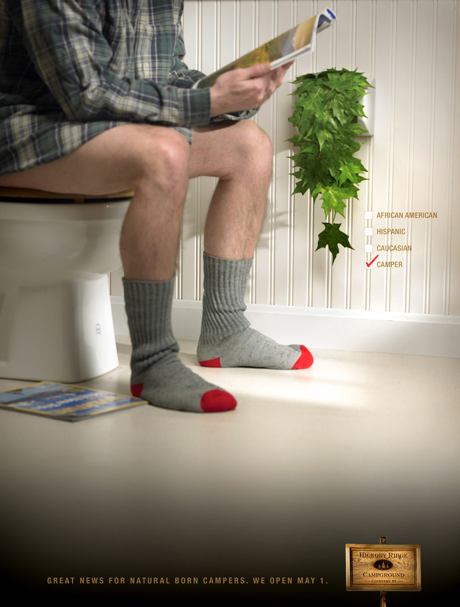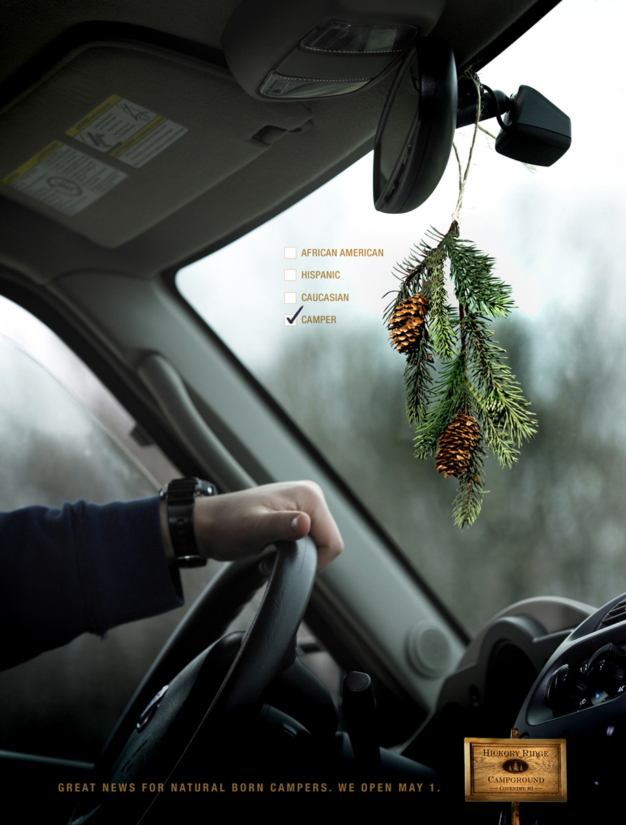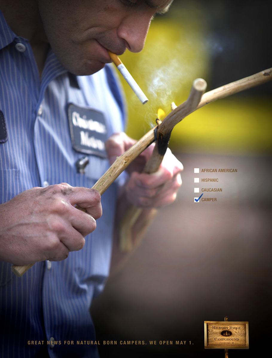 Если вы добываете огонь с помощью деревянных палочек, то Hickory Ridge для васЕсли в душе вы турист, то эта рекламная кампания именно для вас. Она создана американским агентством Bilinki & Groggins для палаточного лагеря Hickory Ridge. По мнению творческой команды, настоящий кемпер от рождения должен выглядеть именно так. Надпись: "Афроамериканец, латиноамериканец, белый, турист Великолепные новости для туристов от рождения. Мы открываемся 1 мая." Агентство: Bilinki & Groggins, Провиденс, США Творческий директор: Tim Needham, Kevin Acciaioli Арт директор: Tim Needham Копирайтер: Kevin Acciaioli Фотограф: Gary Sloan |