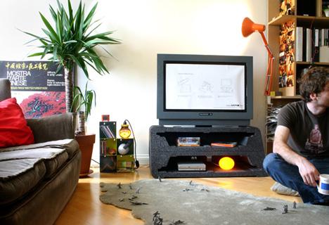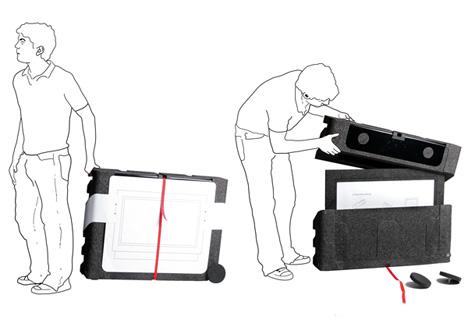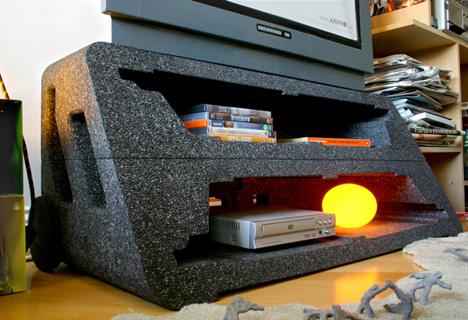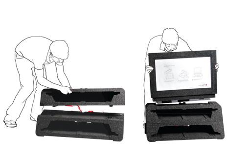 Британский дизайнер Tom Ballhatchet разработал оригинальный дизайн упаковки из пенополистирола (пенопласта) для ЖК-телевизора, которая легко превращается в столик, на который можно поставить как сам телевизор, так и всю сопутствующую электронику.