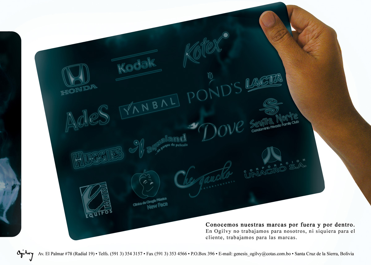 Genesis Ogilvy and Mather Боливия знает своих клиентов изнутриЭтот рекламный плакат выпущен агентством Genesis Ogilvy and Mather в качестве саморекламы. Агентство утверждает, что знает свои бренды не только снаружи, но и изнутри, а в доказательство приводит этот рентгеновский снимок логотипов своих клиентов. Надпись: "Мы знаем наши бренды снаружи и изнутри. В Ogilvy мы работаем не для себя и даже не для нашего клиента, мы работаем для брендов." Агентство: Genesis Ogilvy and Mather, Санта-Крус, Боливия Творческий директор: Cristian Callejas Арт директор: Paola Albornoz Копирайтер: Cristian Callejas, Roland Toledo |