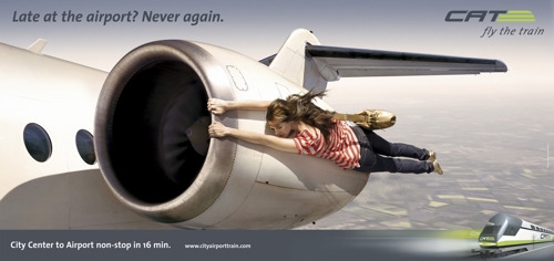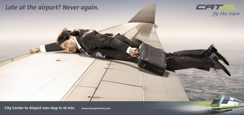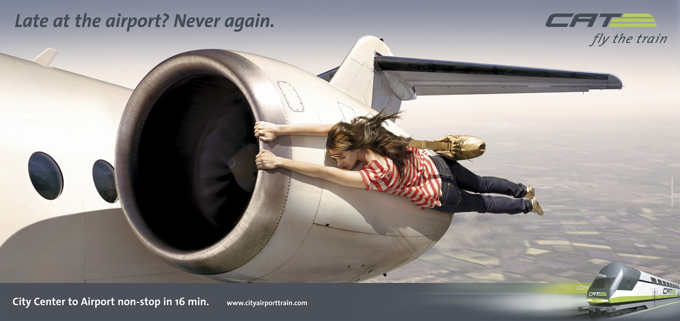 С City Airport Train вам не придется болтаться на крыле самолетаАгентство Demner, Merlicek & Bergmann гарантирует вам, что теперь вы никогда не опоздаете на самолет и не очутитесь в такой же ситуации, как герои этих принтов, созданных для рекламы системы поездов CAT (City Airport Train), которая обещает доставить вас в аэропорт из центра города за 16 минут. Надпись: "Опоздали в аэропорт? Этого больше не случится. От Центра Города к аэропорту без остановок за 16 минут." Агентство: Demner, Merlicek & Bergmann Творческий директор: Bernhard Grafl Арт директор: Bernhard Grafl Копирайтер: Alistair Thomopson Графический дизайн: Marion Schlipfinger Фотограф: Staudinger + Franke |