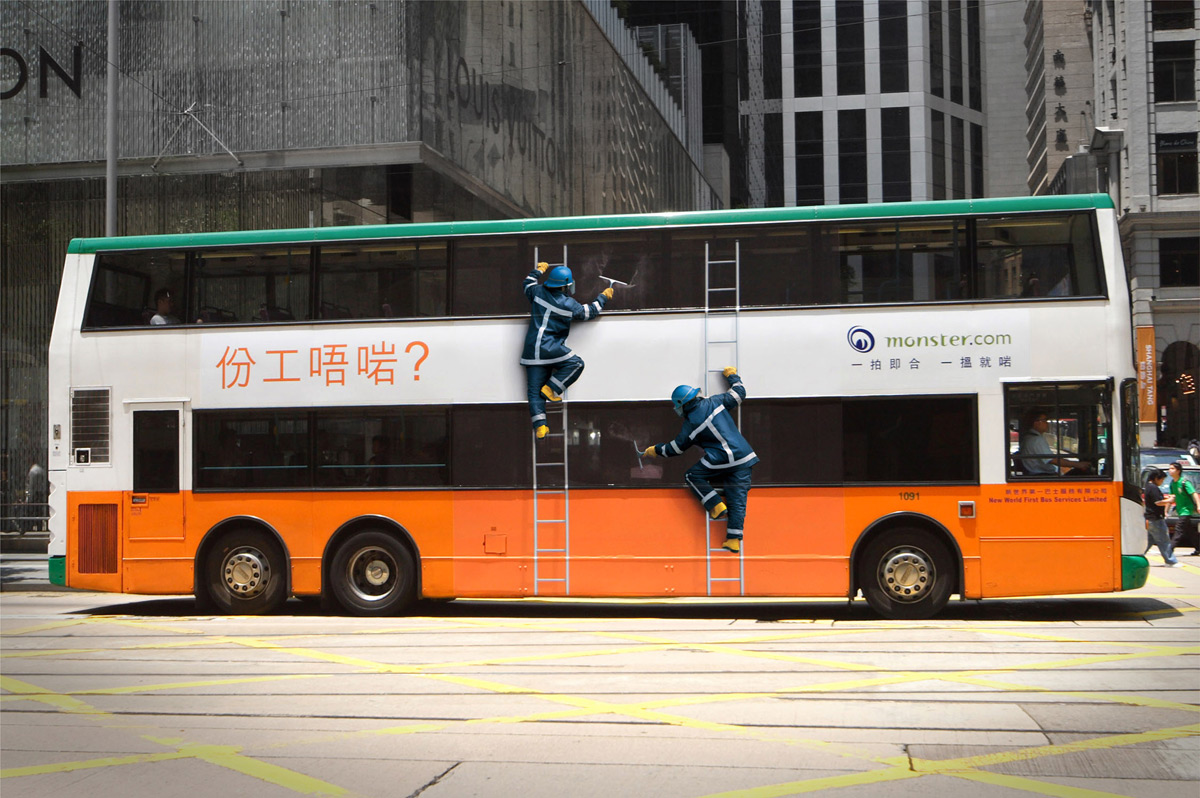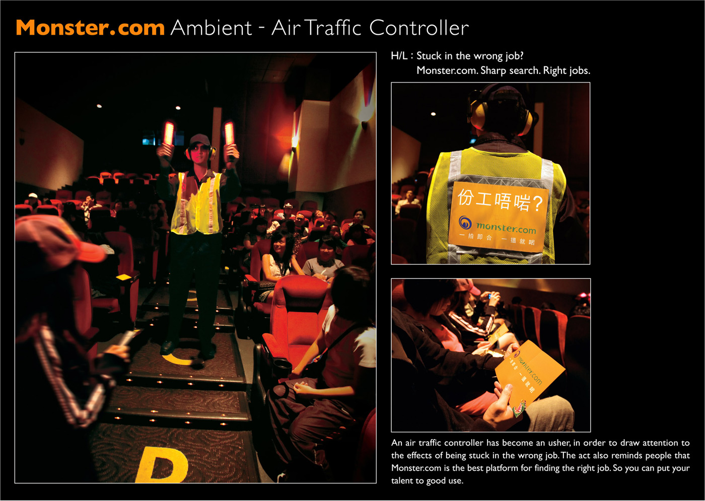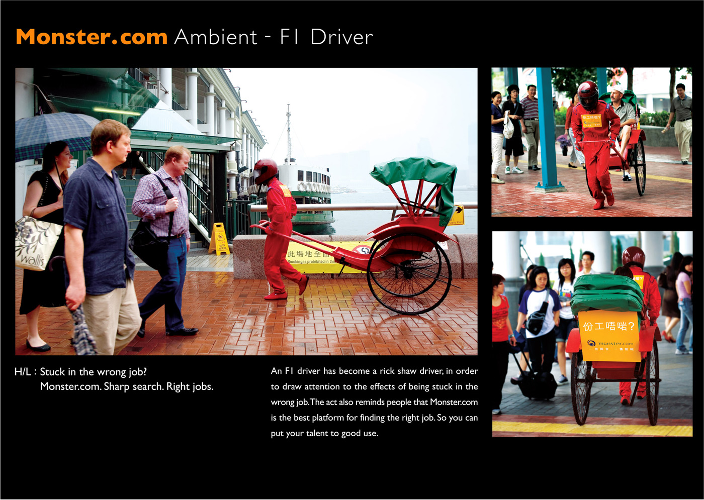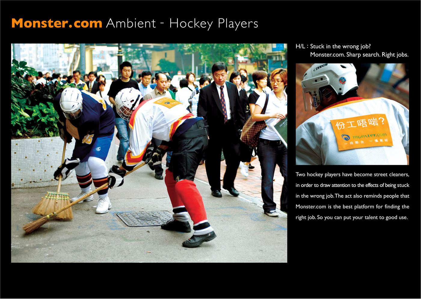 Примеры неправильной работы в рекламной кампании monster.comВыбирая себе работу, многие не знают своего истинного призвания и в результате всю жизнь работают на неправильной работе. Эта рекламная кампания, созданная агентством JWT, призвана показать, как порой ошибаются люди, работая не на той работе: хоккеист по призванию работает дворником, водитель F1 вынужден быть рикшей, футбольный судья раздает флаеры, а хирург работает уличным торговцем. Помочь в этом случае сможет только интернет-портал monster.com. Надпись: "Усердно работаешь на неправильной работе? Monster.com. Быстрый поиск. Правильная работа" Агентство: JWT, Гонконг |