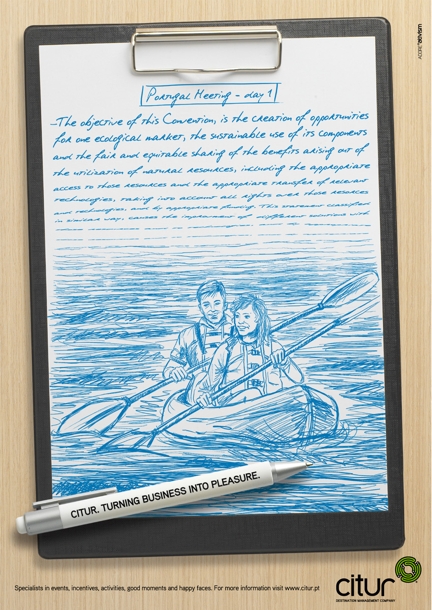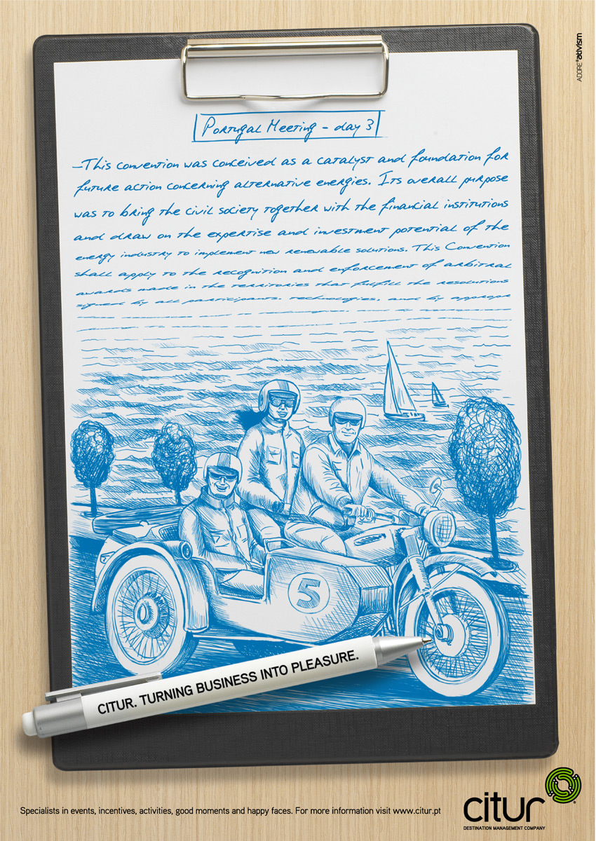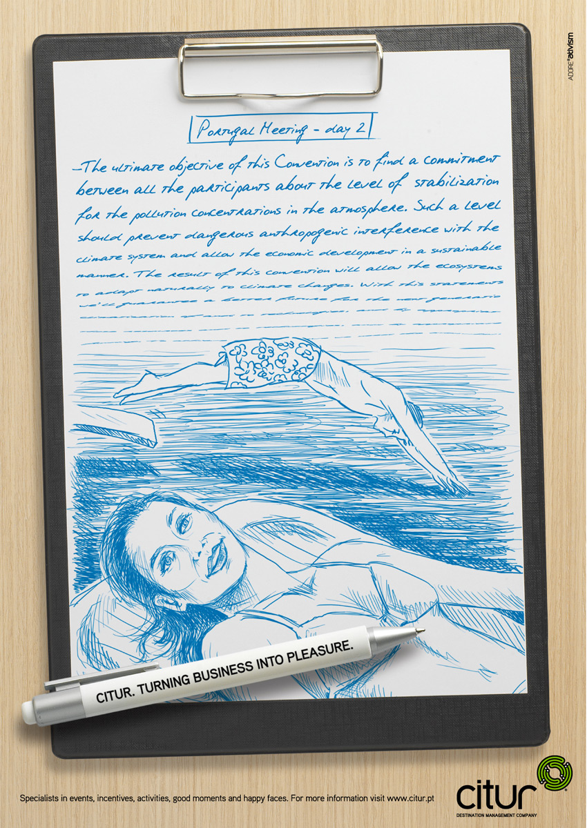 Citur заставит вас забыть о конференцииЭта рекламная кампания разработана португальским агентством Adore Ativism для компании Citur, которая занимается устройством поездок и командировок. Эти плакаты направлены на то, чтобы показать ЦА, что Citur гарантирует хорошее времяпрепровождение и улыбки своим клиентам. Надпись: "Citur. Превращает бизнес в удовольствие" Состав творческой группы Агентство: Adore Ativism, Лиссабон, Португалия Творческий директор: Pedro Pires Арт директор / Иллюстратор: Joao Martins Копирайтер: Lucio Abrunhosa Фотограф: Tiago Brarens |
