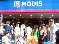 Для продвижения первых 13 магазинов Modis использовала акцию “Оденем бесплатно”. Посетителям магазина предлагалось ответить на несколько простых вопросов — “Любимая одежда ковбоев?”, “Самый популярный журнал мод?” — и принять участие в конкурсе на самое быстрое одевание. Победитель, надевший за 30 секунд больше всех вещей, всю одежду забирал бесплатно. По словам директора по маркетингу Modis Елены Ложкиной, эта акция пользовалась популярностью, но на открытии своего второго магазина в Казани сеть решила испытать новый маркетинговый прием привлечения покупателей, который бы работал на компанию еще долгое время.