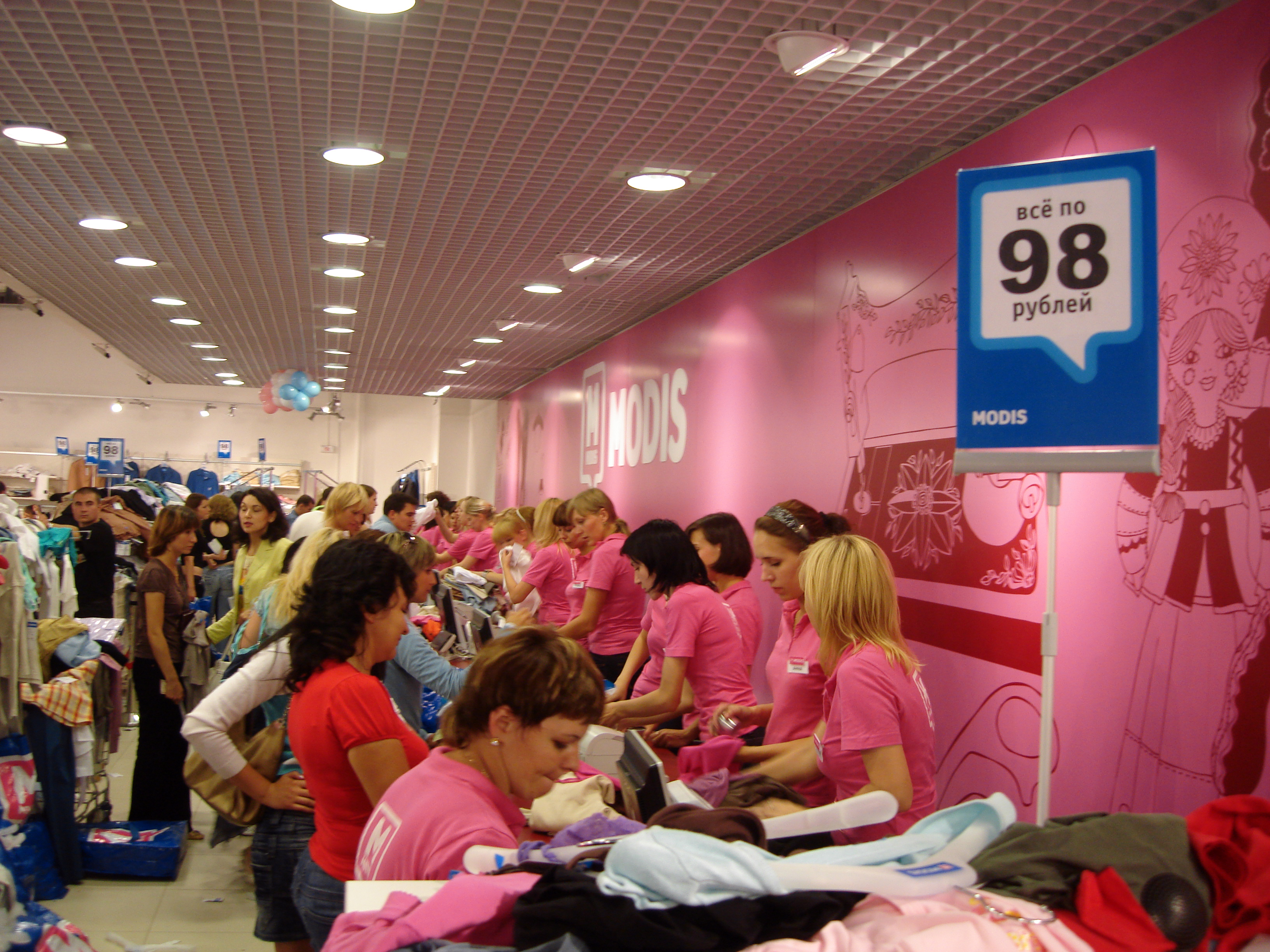 Созданная полгода назад сеть модной одежды Modis придумала, как можно быстро переманить покупателей у вещевых рынков и конкурирующих сетей. Для этого она устроила в своем новом казанском магазине трехдневную распродажу “Все по 98 руб.”. Конкуренты считают такой прием очень эффективным, но ввязываться в ценовую войну с новичком не рискуют.