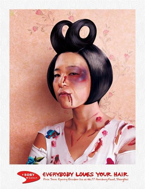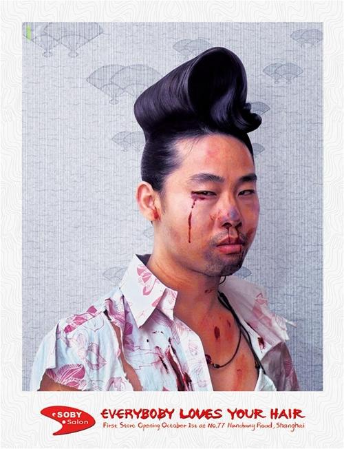Прически от Soby Salon любят всеНа этих плакатах вы видите ужасно избитых людей, а вот с их головы не упало и волоска. Почему? Да все потому, что прически этих людей вызывают восхищение, их любят все, ведь они выполнены в салоне Soby Salon. Но вопрос, почему этих людей избили остается открытым. Вполне возможно, что из зависти. Надпись: "Все любят твои волосы."