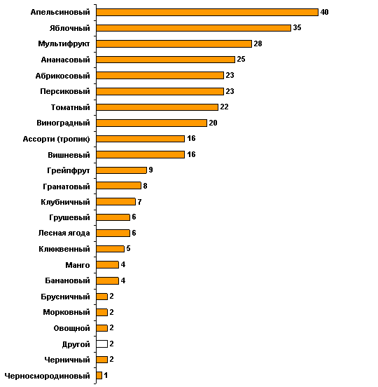 Холостые и незамужние пьют апельсиновый сокВ опросе, проведенном в июле текущего года в рамках очередной волны общероссийского омнибуса, приняло участие 1605 человек, в возрасте от 18 лет и старше. Статистическая погрешность не превышает ± 2,5%. Респондентам был задан вопрос: Соки/нектары каких вкусов Вы предпочитаете? Ответы распределились следующим образом % ![]() 40% россиян предпочитают соки с апельсиновым вкусом. 35% - с яблочным. Чуть более четверти респондентов выбрали мультифрукт (28%). Причем жители городов с населением более 500 тысяч чаще пьют апельсиновые и мультифруктовые соки, тогда как респонденты из небольших городков (менее 100 тысяч человек) в основном выбирают яблочный вкус. Сочные пристрастия участников исследования мало зависят от их пола, образования и социального положения. Однако в результатах опроса все же можно усмотреть некоторые любопытные тенденции. К примеру, апельсиновый сок чаще всего выбирают холостяки и незамужние барышни (44%). Руководители предприятий (41%) значимо чаще, чем служащие (27%), рабочие (18%) и пенсионеры (18%) употребляют ананасовый сок. 15% респондентов из числа людей с начальным и неполным средним образованием выбрали клубничный сок. Вишневый (26%), грейпфрут (17%) и гранатовый соки(13%) значимо чаще употребляют интервьюируемые с высоким доходом, нежели со средним (17%, 8% и 8% соответственно) и низким (11%, 7% и 7%). Наименее популярными оказались черносмородиновые соки (1%). Черничный (2%), брусничный, морковный и овощной набрали по 2% голосов от общего числа опрошенных. Респондентам был задан вопрос: Сколько литров сока/нектара в среднем за неделю потребляет Ваша семья? Ответы на него распределились следующим образом % ![]() Большая часть опрошенных россиян ответили, что в их семьях в среднем выпивают по два-три литра (41%) сока в неделю. Менее литра чаще всего выпивают жители сельской местности (26%), а четыре-шесть литров сока – норма для респондентов, живущих в городах-милионниках (20%). Каждый пятый квалифицированный специалист ответил, что его семье требуется в среднем по три литра сока в неделю (21%). Выяснилось также, что потребление сока зависит от дохода респондента. Значительное число граждан (23%) с невысоким доходом выпивают менее одного литра сока в неделю, тогда как практически каждый пятый респондент с доходом выше среднего ответил, что за указанный промежуток времени в его семье выпивают по четыре-шесть литров сока. www.rmh.ru |
