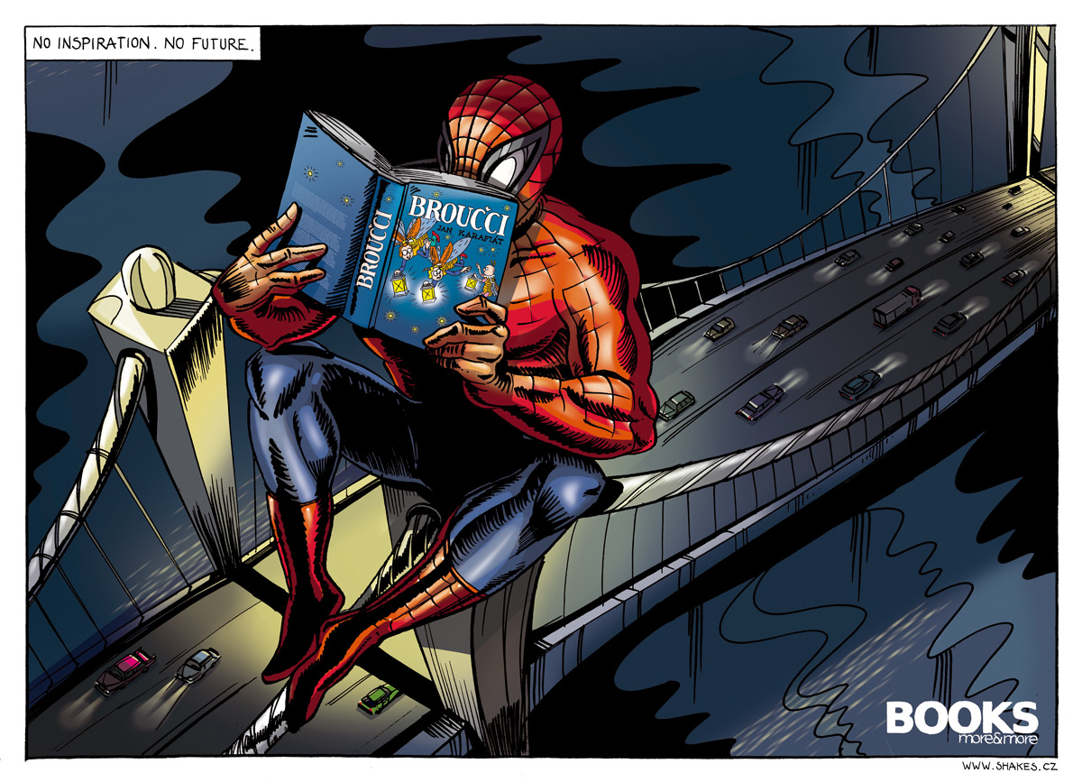 Супергерои комиксов рекламируют книгиПражское отделение Publicis привлекло на свою сторону знаменитых супергероев комиксов, чтобы продемонстрировать детям всю важность чтения книг. На первой печатной работе изображен персонаж издательства Marvel Человек-Паук, читающий детскую книгу "Beetles", написанную Jan Karafiat в 1867 году. Второй принт изображает Женщину-Кошку, персонажа главного конкурента Marvel - издательства DC Comics. В ее руках книга для детей "All About Dog and Pussycat. Сопровождает принты слоган "Нет Вдохновения. Нет будущего". |