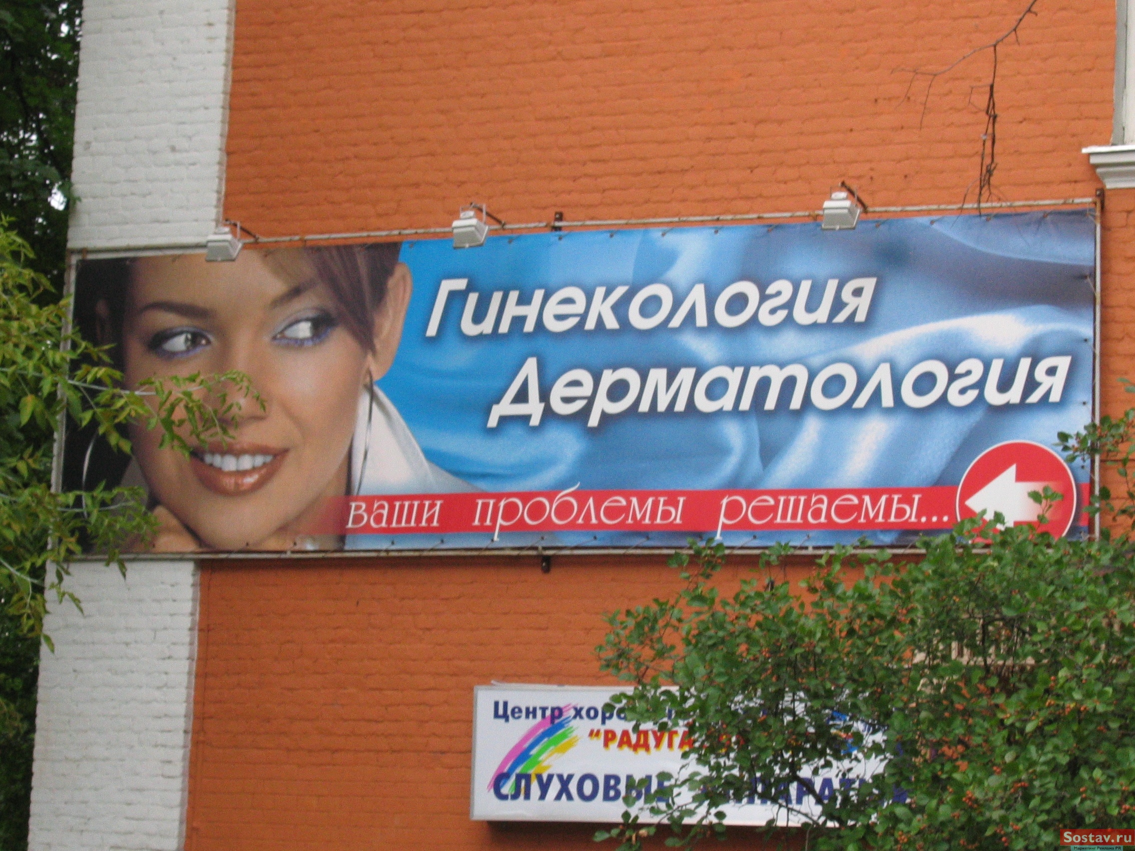 В подмосковной Балашихе появилась наружная реклама городского центра гинекологии и дерматологии с использованием образа, очень похожего на известную телеведущую канала "Домашний" Татьяну Плотникову. "Ваши проблемы решаемы", - говорит с плаката симпатичная девушка, а красная стрелка в углу указывает на место расположения центра.