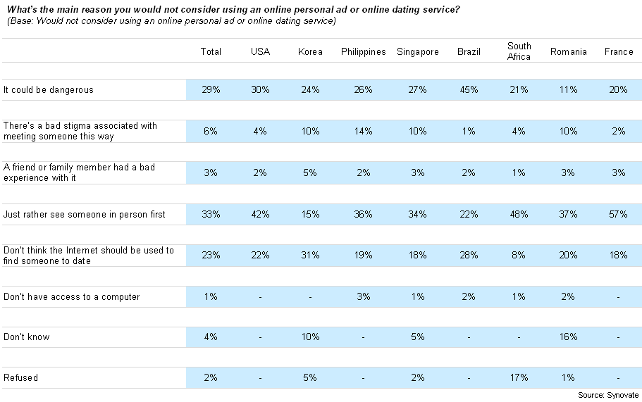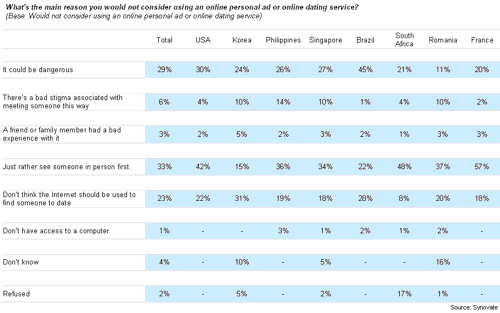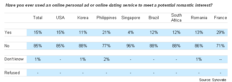 По-разному также относятся участники опроса к тому, через какой промежуток времени они готовы перейти от виртуального общения со своим партерном к реальному знакомству офф-лайн. 32% филиппинцев совершенно не спешат увидеть своего виртуального знакомого, - по меньшей мере, пройдет месяц, прежде чем они решатся на встречу в реальности, тогда как французы, американцы и бразильцы более нетерпеливы и готовы на встречу офф-лайн уже через неделю виртуальной переписки. А вот румыны вообще не теряют времени даром – 16% уже готовы встретиться с тем, с кем познакомились в Сети в тот же день! Интересно отметить, что в некоторых странах виртуальные знакомства вообще не рассматриваются как что-то, что может привести к свиданиям в реальной жизни. Так, 54% корейцев отмечают, что никогда не пойдут на реальное свидание офф-лайн. Самый негативный опыт общения с партнером по электронной переписке у французов – 58% отмечают, что у них были ужасные свидания с теми, с кем они общались в Интернете. Однако, две трети все же спешат заверить, что, в конечном итоге, на их опыте больше удачных, чем неудачных встреч в реальности. Американцы тоже знакомы с разочарованием от встреч с теми, с кем до этого общались только в Сети. Больше половины упоминают о «свиданиях-катастрофах», хотя все же у 64% американцев больше положительных воспоминаний о встречах в реальности. Среди участников опроса, которые имеют опыт общения со своим партнером вживую, отмечается заметный уровень успеха в плане налаживания личной жизни. 25% всех респондентов познакомились со своим будущим супругом (супругой) через Интернет. Больше всего браков среди тех, кто нашел свою любовь на сайтах знакомств, заключают американцы и французы (42% и 28% соответственно). Опасные незнакомцы Однако, несмотря на успешные результаты в поиске своей второй половины одних, для большинства Интернет знакомства являются довольно спорным вопросом. 95% корейцев, которые никогда не посещали сайты знакомств, отмечают, что они не рассматривают Интернет как средство поиска романтического партнера. Аналогично к этому вопросу относятся 85% бразильцев и 84% сингапурцев. Исполнительный директор Synovate Сингапур Миранда Чонг отмечает, что только 4% сингапурцев когда-либо пользовались сайтами знакомств, несмотря на то что в общем, уровень пользования Интернетом в стране достаточно высокий. "В последние десятилетия Правительство Сингапура проводит различные акции, направленные на увеличение количества заключения браков и обретение одинокими людьми своих вторых половинок. Может быть, именно поэтому Интернет не рассматривается сингапурцами, как одно из основных средств для поиска партнера для семейной жизни," рассуждает Миранда. "Многие чувствуют себя более комфортно обращаясь в частные брачные агентства, работа которых отчасти курируется правительством, чем используя возможности Интернета для поиска потенциальных супругов." Synovate также заметил множество негативных реакций по отношению к сайтам знакомств и среди участников других стран, участвовавших в исследовании. Почти одна треть тех респондентов, которые не рассматривают Интернет как средство для знакомств с потенциальными партнерами отмечают, что такие знакомства могут быть очень опасными: по мнению 77% участников опроса данные, заявленные в анкетах претендентов на сайт