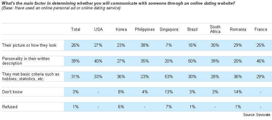 Отчаянный поиск любви в сети29% французов и 21% филиппинцев нашли свою вторую половину с помощью Интернета. Однако, как показало недавнее международное исследование компании Synovate, те люди, которые не пользуются различными сайтами знакомств, для того чтобы найти свою любовь, заявляют, что только «совсем отчаявшиеся» могут решиться на это. Чтобы понять, что заставляет людей искать свою судьбу в сети, кто эти люди, и насколько успешным оказался поиск партнера на просторах Интернета, Synovate опросил 4,386 респондентов в Бразилии, Франции, Кореи, Филиппинах, Сингапуре, Южной Африке, Румынии и США. Согласно результатам исследования, сторонники Интернет знакомств и противники виртуальных встреч разделились на два практически одинаковых лагеря: с одной стороны, 49% опрошенных считают, Интернет – это отличный способ знакомиться с людьми, с другой стороны, 48% уверены, что это напрасная трата времени. Тем не менее, исследование выявило довольно существенную разницу в уровне использования Глобальной Сети и степени комфорта среди представителей различных стран. В целом, 15% всех участников опроса отметили, что они использовали сайты Интернет знакомств, для того чтобы завязать романтические отношения. При этом, самый большой процент человек, которые участвуют в виртуальных свиданиях, наблюдается среди французов (29%), филиппинцев (21%) и американцев (15%). Вы когда-нибудь использовали сайты Интернет знакомств с целью найти потенциального партнера для романтических отношений? "Интернет можно рассматривать сегодня как «современную сваху»”, - отмечает Стив Левайн, главный вице президент и глава департамента Технологий и Телекоммуникаций Synovate США и Латинской Америки. "Интернет с каждым днем все больше интегрируется в нашу жизнь, поэтому совершенно закономерно ожидать, что все больше и больше людей будут использовать Сеть для того, чтобы устроить свою личную жизнь." Виртуальные знакомства Развлечение – вот что движет большинством (46%) посетителей сайтов Интернет знакомств, среди них 67% бразильцев, 50/% американцев, 49% румынов «встречаются» с другими в сети из любопытства или забавы ради. В то время как четвертая часть всех виртуальных партнеров рассматривают отношения в сети как нормальное практику регулярного использования Интернет. Любопытно отметить тот факт, что несмотря на то, что фотография является одним из основных критериев выбора партнера для виртуальной коммуникации, по мнению одной четвертой части опрошенных; 39% участников все же больше внимания обращают на словесное описание человека, который представил свою анкету в сети, а 32% также стремятся найти совпадения в плане общих интересов и хобби. Внешность виртуального партнера является самым важным критерием для 38% филиппинцев и 30% южноамериканцев. Тогда как половина (50%) бразильцев рассматривают личность и индивидуальность в качестве самого важного критерия. А вот азиаты - сингапурцы (53 %) и корейцы (36%) ищут того, кто бы полностью соответствовал списку их требований. Что является основным критерием выбора партнера на сайте знакомств для дальнейшей коммуникации? (база: те, кто использовал сайты знакомств)