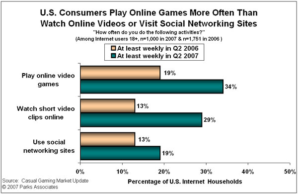 34% взрослых американцев, пользующихся Интернетом, играют в онлайновые игры хотя бы раз в неделю. 29% смотрят в онлайне короткие видеоклипы и только 19% посещают социальные сайты с той же частотой.