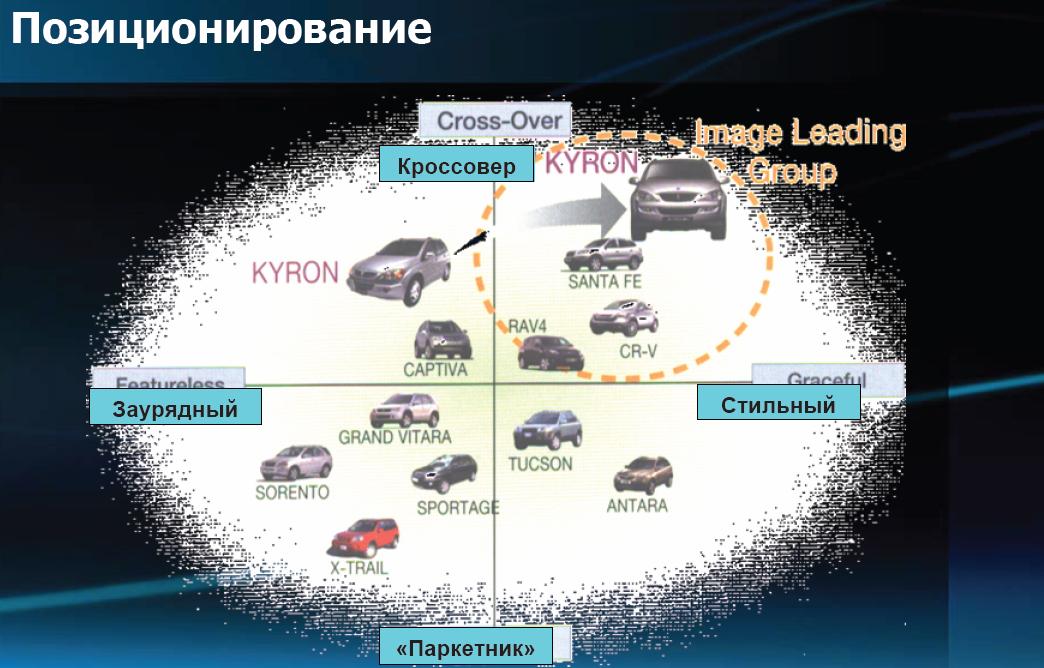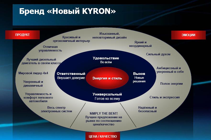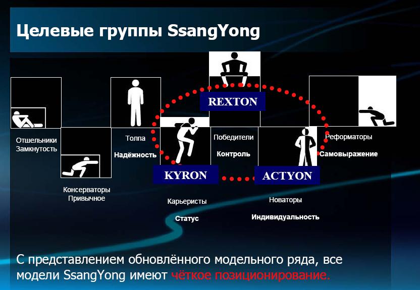 Sostav.ru стал известен план коммуникационной кампании по продвижению SsangYong российскому потребителю. Новое глобальное позиционирование SsangYong в России теперь будет отвечать таким тезисам, как "современный, гибкий подход", "надёжные и качественные автомобили", "идеальное сочетание цены и качества". Маркетологи рассчитывают на переход Kyron из заурядных кроссоверов в разряд стильных, к которым относят конкурентов из Toyota (Rav), Hyundai (Santa Fe) и Honda (CRV). По мнению дизайнеров, этому способствуют обновленная геометрия кузова, полностью измененные формы фар и задних фонарей, фальш-решетка радиатора, новые бамперы, а так же другие изменения экстерьера и интерьера. Основной целевой аудиторией SsangYong Kyron будут мужчины (90%). Демографическое ядро находится в диапазоне 35 - 45 лет. Предполагается, что интересоваться автомобилями SsangYong будут владельцы small и medium SUV, а также обладатели легковых автомобилей D и Е. Соотношение по географическому признаку между Москвой и регионами будет составлять 60 на 40 процентов. Статус и занятость покупателя: менеджеры и руководители среднего и высшего звена, ведущие специалисты крупных российских и западных компаний, владельцы, или партнеры собственного мелкого и среднего бизнеса. Психографический портрет покупателя рисует успешного, самоуверенного, индивидуалиста, лидера по натуре, который следит за модой, новинками и трендами, а также любит выделяться на фоне остальных и предпочитает покупать добротные, качественные товары длительного пользования. Его увлечениями и хобби могут быть: активный отдых с друзьями, семьей на природе, поездки на дачу с семьёй, фитнес и спорт, современные виды спорта, туризм и пр. По замыслу маркетологов, новое поколение внедорожников сочетает в себе как рациональные, так и эмоциональные качества (практичность, универсальность, надёжность, экономичность, новый дизайн и разумная цена). Одним из важных рычагов воздействия на потребителя станет информация о технологиях Merсedes-Benz, используемых во всех автомобилях SsangYong. Ключевым в восприятии "Кайрона" потребителем станет желание обладать кроссовером, в котором есть все, что нужно для универсального автомобиля и нет ничего лишнего. "Он выручит меня в любой ситуации, - гласит слоган возможной печатной рекламы. - Комфортный и универсальный, он каждый день будет дарить мне удовольствие и не потребует чрезмерных затрат на эксплуатацию". Цепочка акцентов в коммуникации выстроена на основных потребительских качествах: элегантный стиль - привлекательный дизайн, драйв и энергия - проходимость и маневренность, практичность и универсальность - безопасность и комфорт, надёжность и качество - экономичные двигатели. Планы "Сересталь-Авто" достаточно амбициозны. Компания планирует занять лидирующие позиции в сегменте среднеразмерных SUV в самое ближайшее время. Прогнозируется увеличение дилерской сети с 85 до 100 компаний к концу года. Будет организована экспансия в города с населением от 200 до 500 тыс. человек и развитие суб-дилерской сети в городах с населением менее 200 тыс. человек. План продаж корейской марки на 2007 год составляет 150 000 штук. Это вполне реально, учитывая, что общий рост продаж SsangYong в I полугодии 2007 года составил 289%.