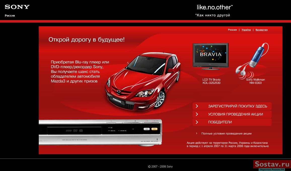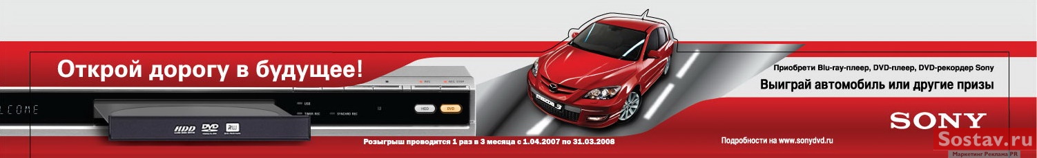 Дорога в будущее длиною в год. Агентство Ark Connect проводит акцию для Sony DVDC 1 апреля 2007 по 31 марта 2008 агентство Ark Connect проводит национальную акцию "Открой дорогу в будущее!" для компании Sony СНГ на территории России, Украины и Казахстана. Как привлечь людей к использованию новых технологий? Как победить в войне форматов Blue Ray и HD? Конечно же, мотивируя покупателей привлекательными подарками. Поэтому ежемесячно в течение года компания Ark Connect проводит розыгрыш призов среди тех, кто купил Blue Ray проигрыватель или DVD-плеер / рекордер Sony. И подарки эти слишком хороши, чтобы перед ними устоять. Совсем недавно в России был проведен первый розыгрыш, и первая партия призов, за исключением главного, уже вручена. Передача автомобиля Mazda 3 новому владельцу состоится 10 августа 2007 года. В Казахстане и Украине первый розыгрыш пройдет 9 октября 2007 года. ![]() ![]() ![]() ![]() ![]() |